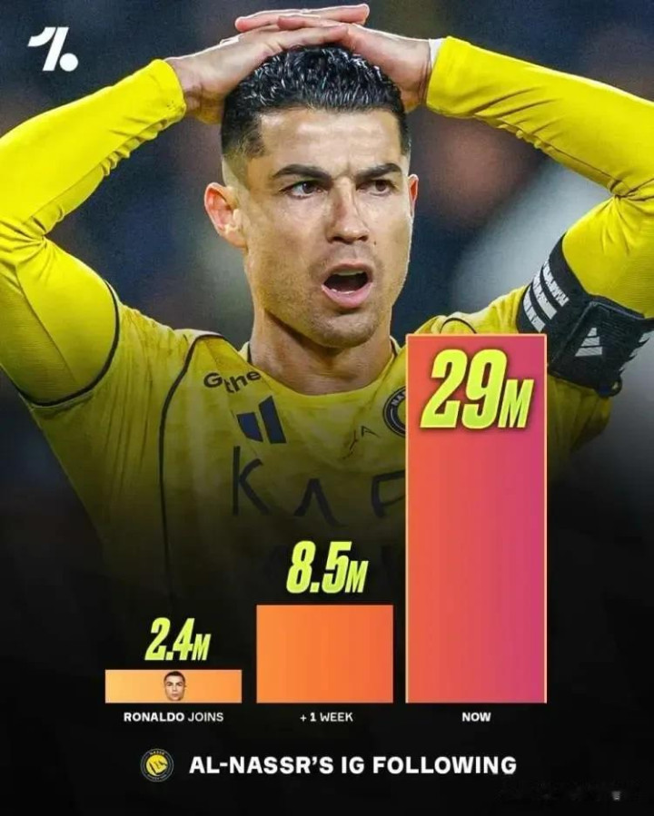 在结束罢赛后,C罗的快速回归并收获进球,不仅将个人进球数扩大到962粒,距离千球目标近在咫尺,更重要的是,他回归之后很快就让利雅得胜利甚至沙特联赛当轮比赛再次收获颇多关注度。一些媒体报道指出,C罗的影响力显而易见,整个沙特才2900万人口,而C罗所在的利雅得胜利某社交媒体的粉丝数已经超过了3500万。