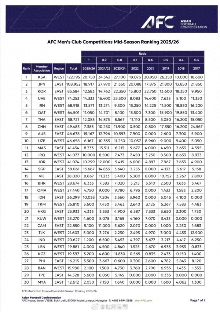 2月23日,近日,亚足联在官网更新了2025/2026赛季男子俱乐部赛事的中期排名,揭晓了各大联赛在8年积分榜上的最新排位。继沙特联赛连续两季高居榜首之后,日本、韩国和阿联酋联赛紧随其后,分列第2至第4位;伊朗第5,卡塔尔第6,印尼凭借本赛季的出色表现一举跃升至第18位。