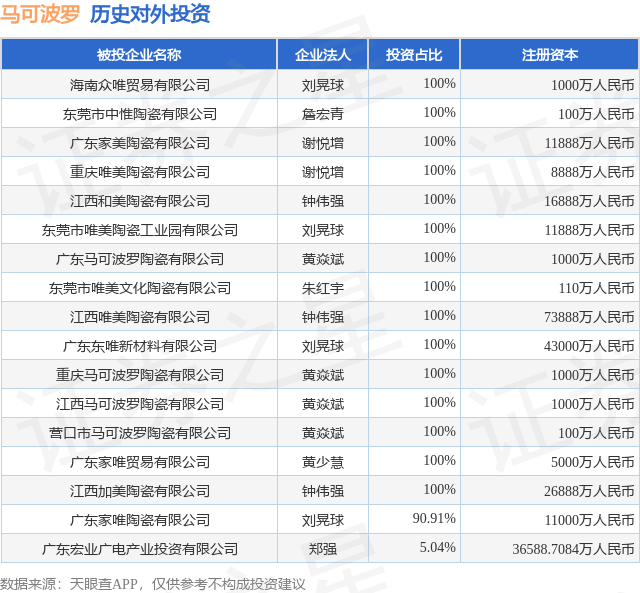 本站消息掌乐策略,根据天眼查APP显示,马可波罗(001386.SZ)新增一起对外投资事件,被投资公司为海南众唯贸易有限公司,法定代表人刘晃球,投资占比为100%。该公司从事批发业,注册资本为1000万人民币。目前,马可波罗共存在对外投资17项,详见下表: